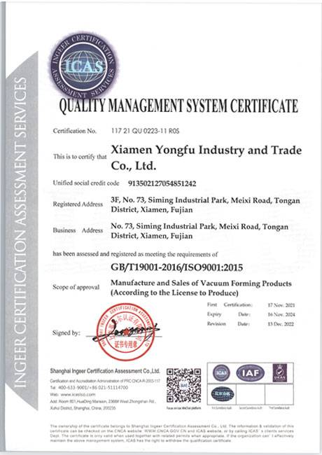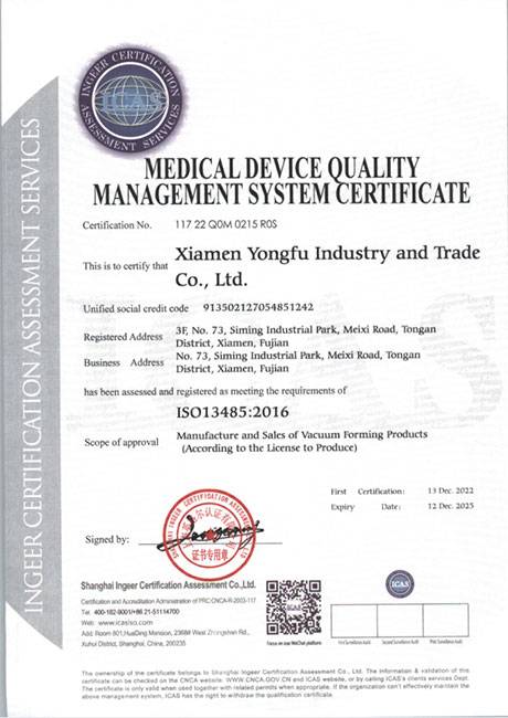 我們通過ISO9001:2015質(zhì)量管理、ISO14001:2015環(huán)境管理體系認(rèn)證,ISO13485:2016醫(yī)療器械質(zhì)量體系認(rèn)證,我們在吸塑行業(yè)領(lǐng)先使用萬級無塵車間,整個車間配備中央空調(diào)、防靜電地板、智能換氣設(shè)計。